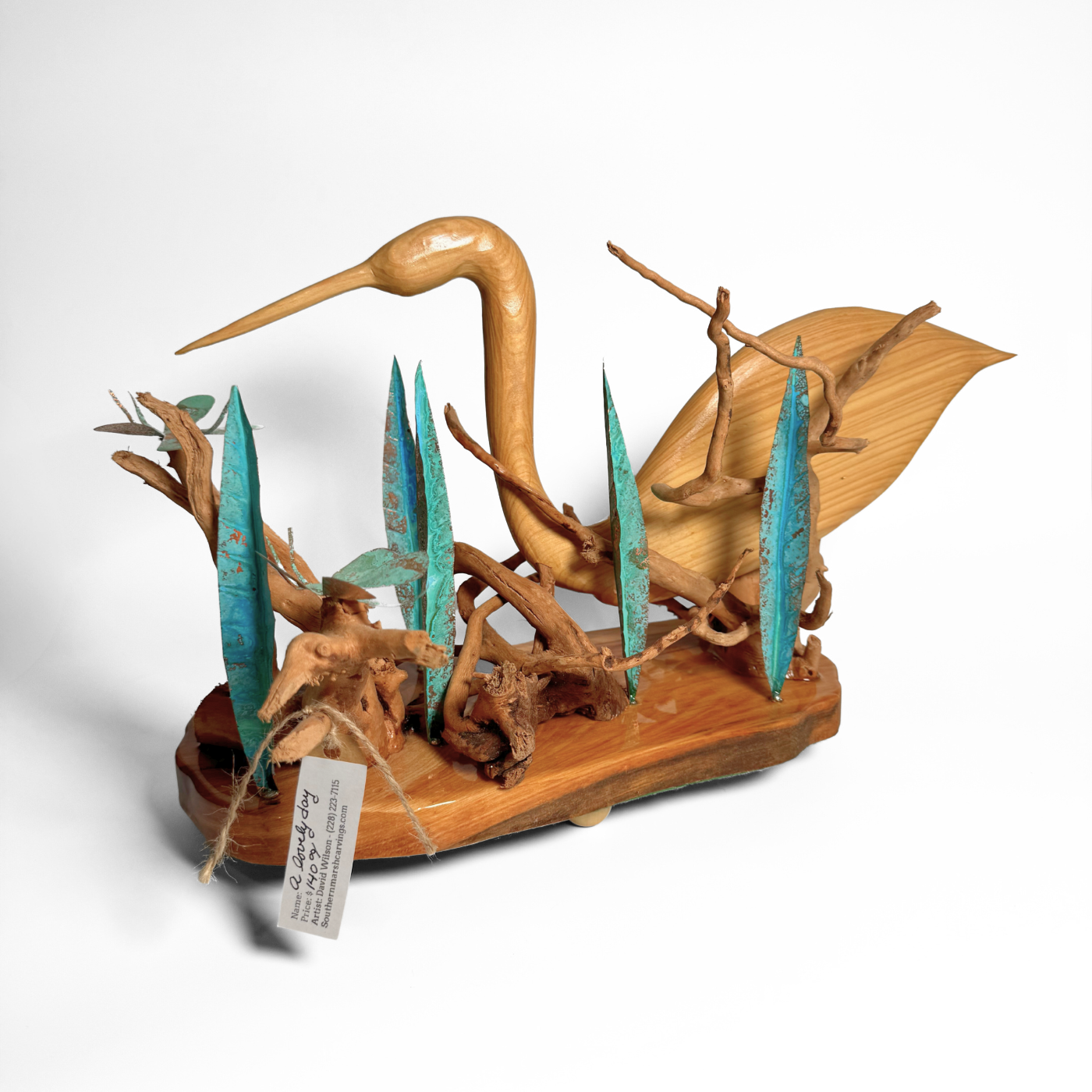 Detailed wooden bird sculpture on a natural driftwood base with verdigris copper reeds and a metal dragonfly. Rustic nature art piece.