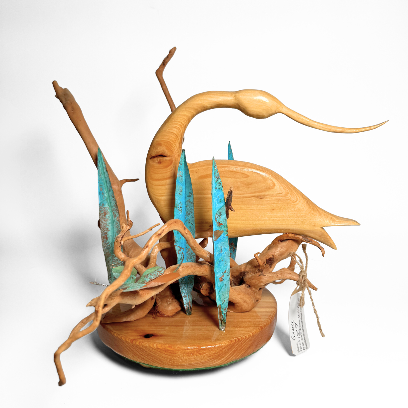 Handcrafted wooden bird sculpture with natural grain, on a gnarled driftwood base. A delicate blue butterfly adds charm for elegant home decor.