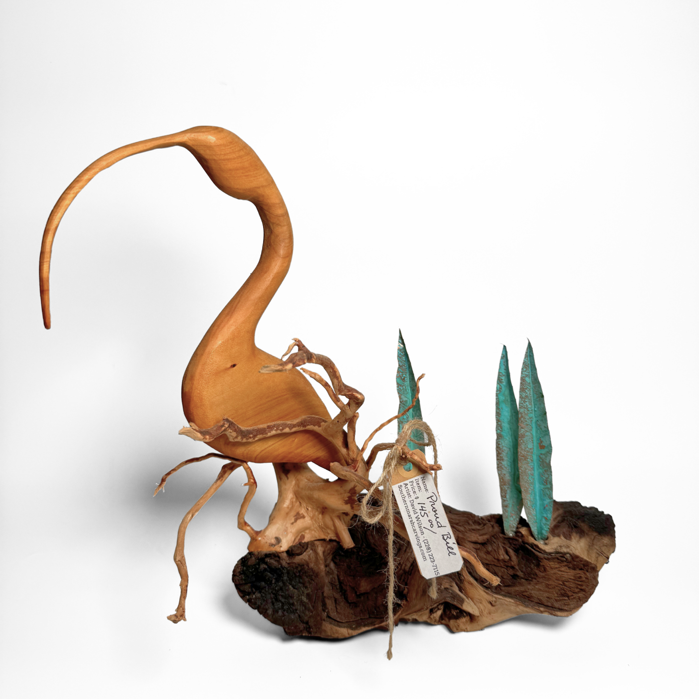 Detailed wooden bird sculpture on a natural driftwood base with verdigris copper reeds and a metal dragonfly. Rustic nature art piece.