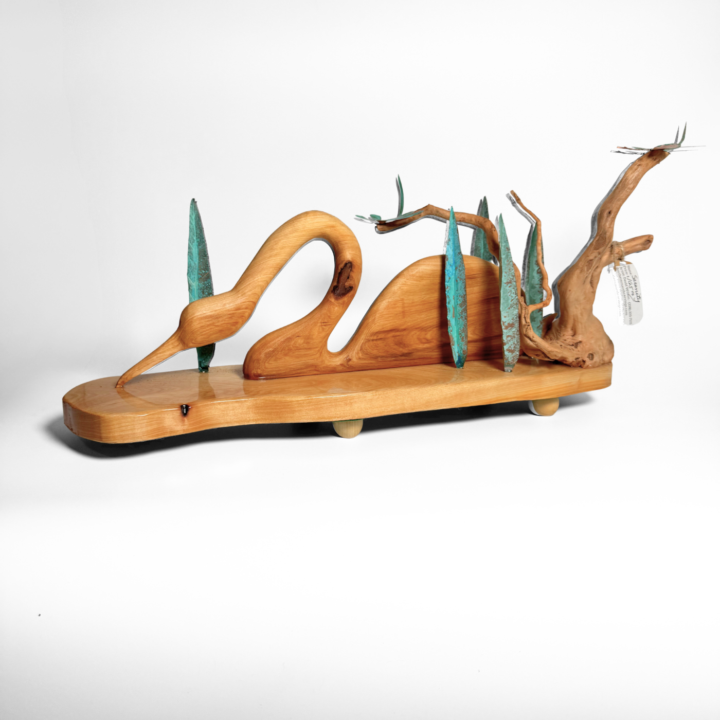 Detailed wooden swan sculpture on a natural driftwood base with verdigris copper reeds and a metal dragonfly. Rustic nature art piece.