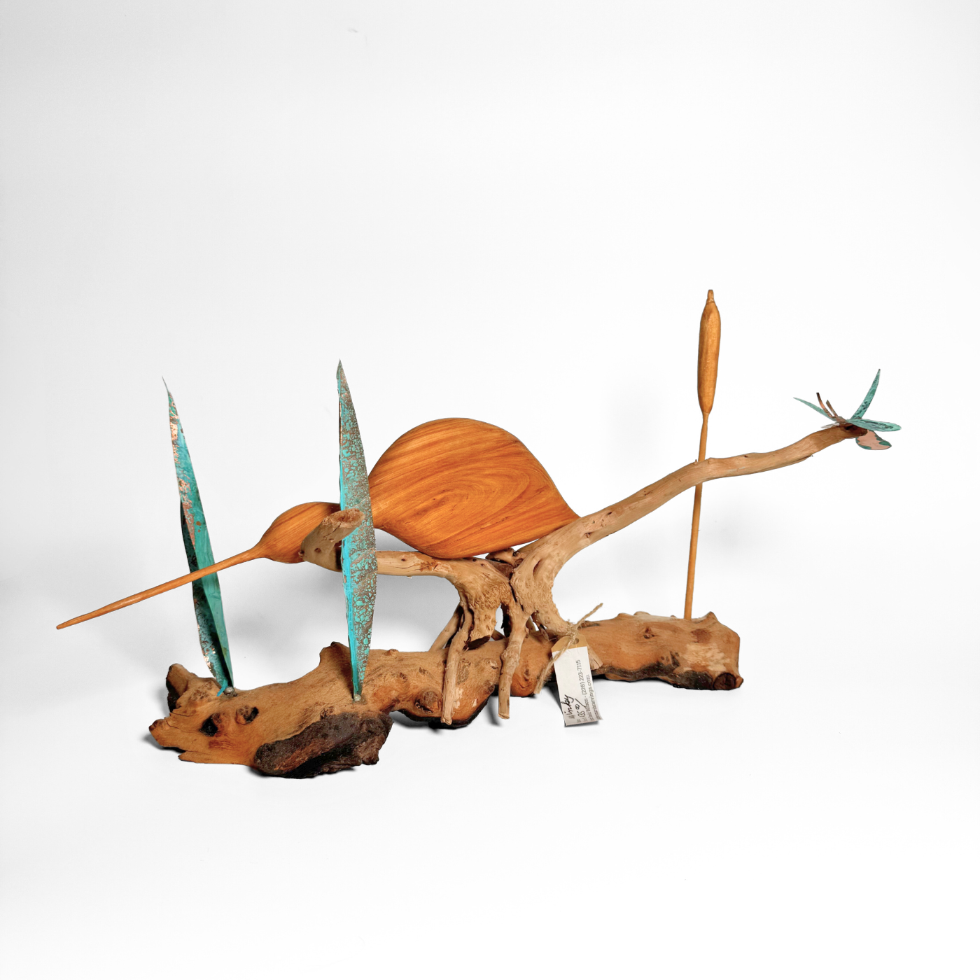 Detailed wooden bird sculpture on a natural driftwood base with verdigris copper reeds and a metal dragonfly. Rustic nature art piece.